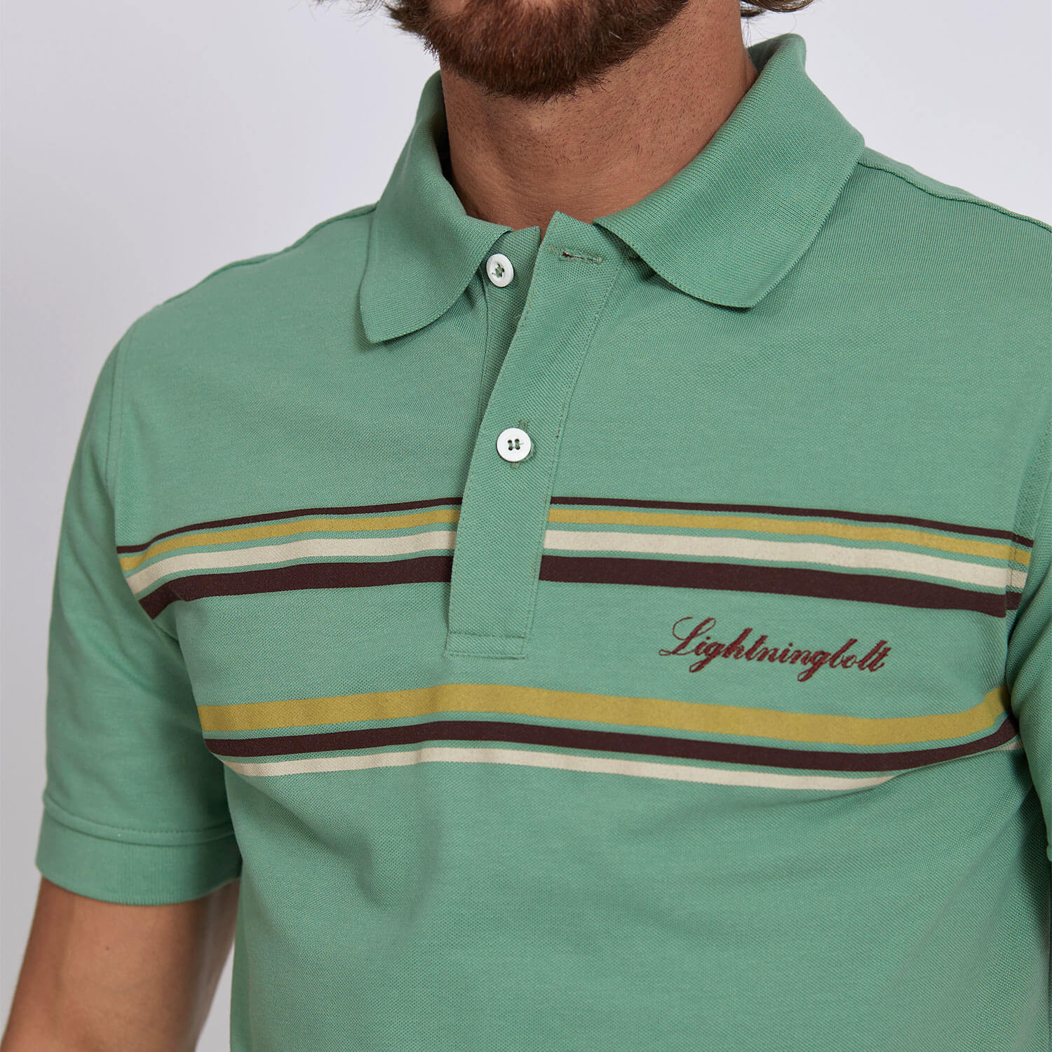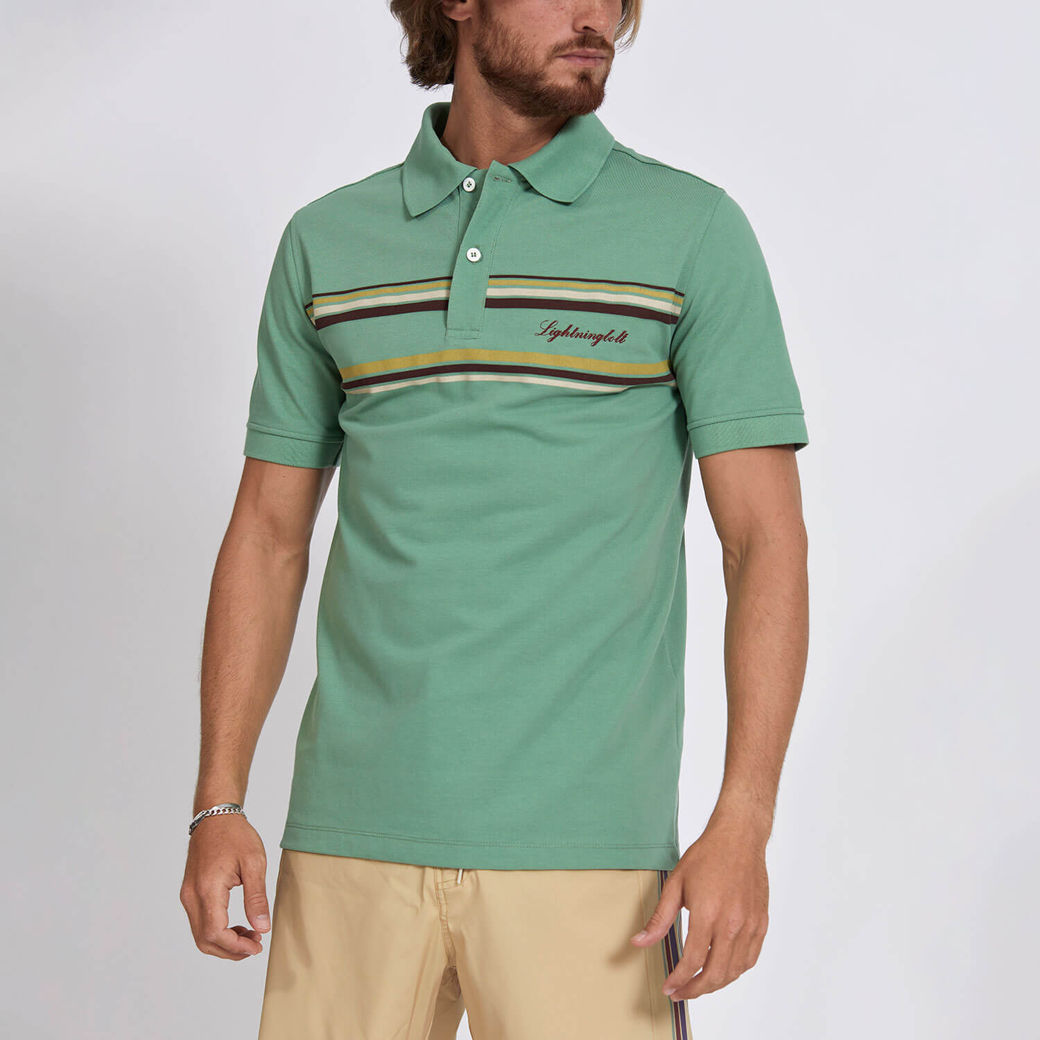 Volte no tempo com o nosso Polo Verde Listrado Vintage anos 80, confeccionado em piquê de algodão premium para máximo conforto e durabilidade. Com uma gola clássica com dois botões, este polo apresenta listras frontais retro e um logotipo bordado à mão no peito, adicionando um toque de estilo intemporal.