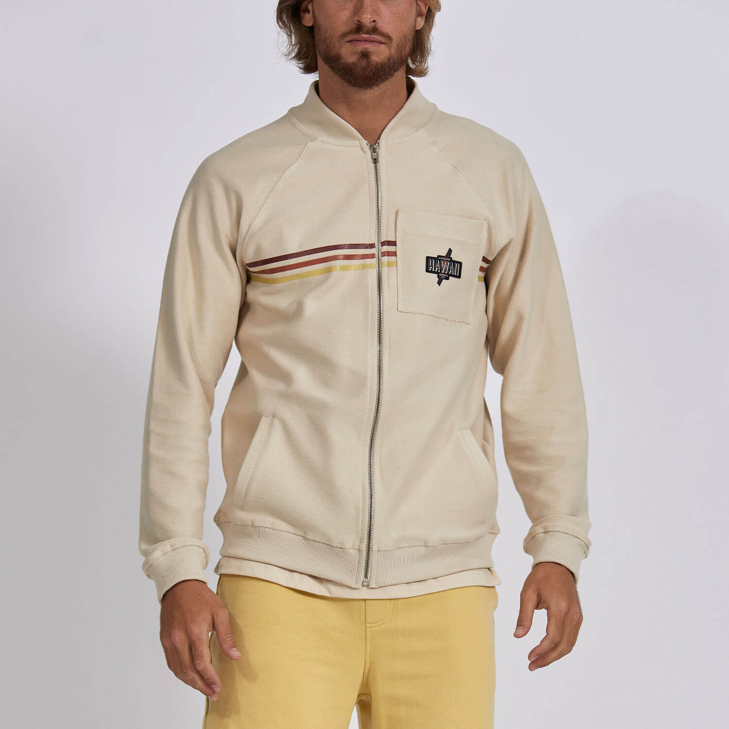 • Gola, Punhos e Barra Canelados: O acabamento em malha elástica retém o calor, mantém a forma e garante a silhueta icónica do bomber.