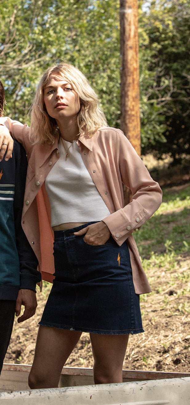 Esta saia icónica combina o estilo intemporal do denim com o toque distintivo do Raio: uma homenagem à nossa herança dos anos 70 e estilo descontraído. Com dois bolsos frontais e um detalhe bordado do Raio no lado esquerdo, a peça é finalizada com uma bainha desfiada.